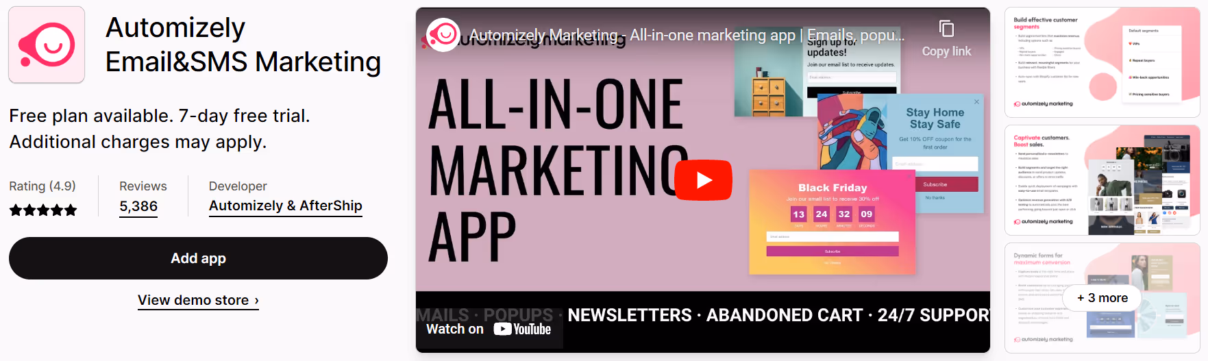 Automizely is an all-in-one marketing platform with features that empowers brands to drive leads, customer engagement and sales, like Web Push notifications, free shipping bars/ announcement bars, trusted payment badges to build trust during payment, count down timer, and lot more