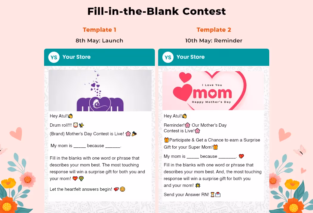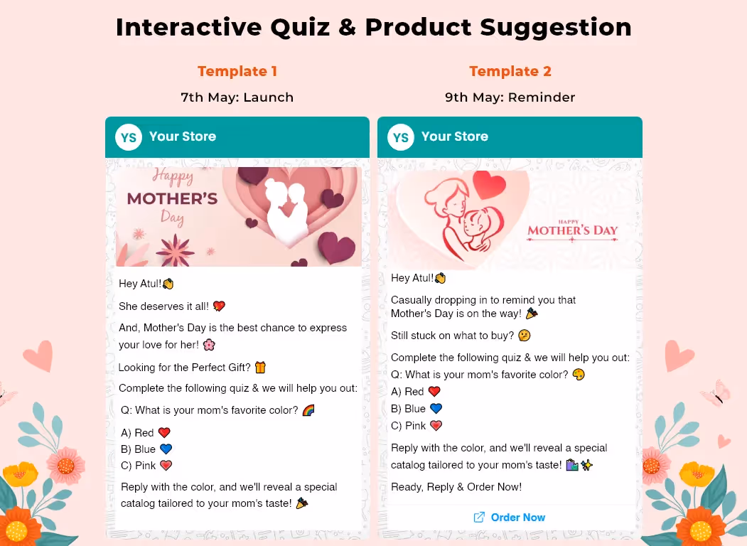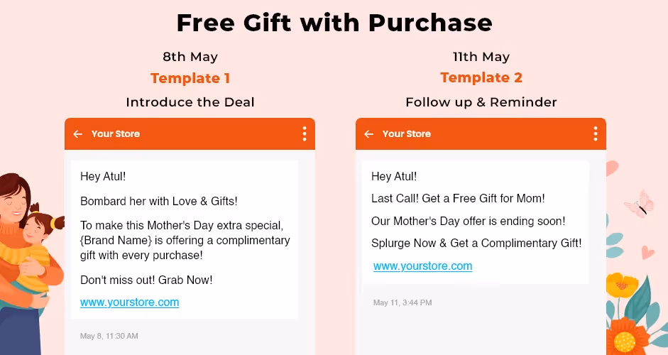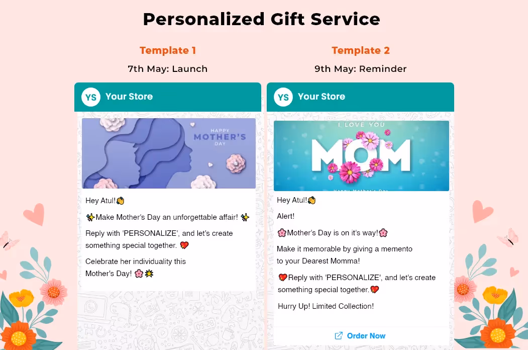 Launch a personalized collection for Mother's Day as it will make for a unique gift that your customers would love to purchase. Your WhatsApp marketing templates can look like this-
