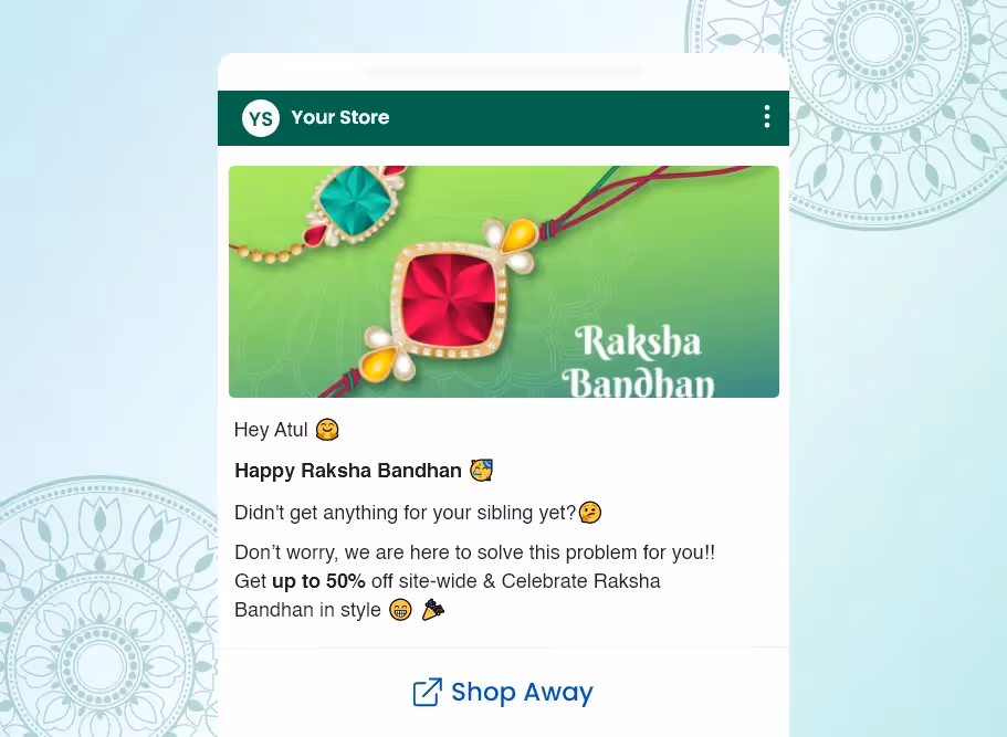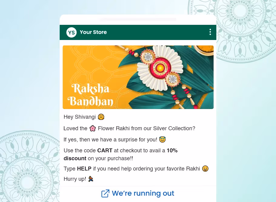 Announce ongoing Raksha Bandhan discounts through WhatsApp Broadcast with witty one-liners to attract customers and use an appropriate product or Raksha Bandhan-themed images for the WhatsApp Template to get customer attention.