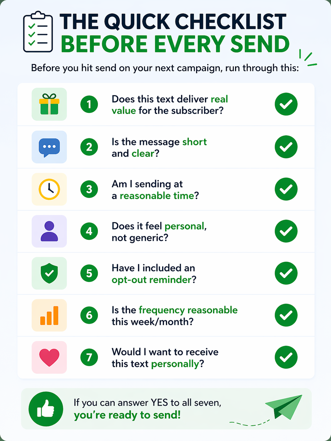 At the end of the day, text message marketing only works when people actually want to hear from you. It’s about sending messages that feel useful, timely, and worth reading. That’s what keeps people subscribed and engaged.