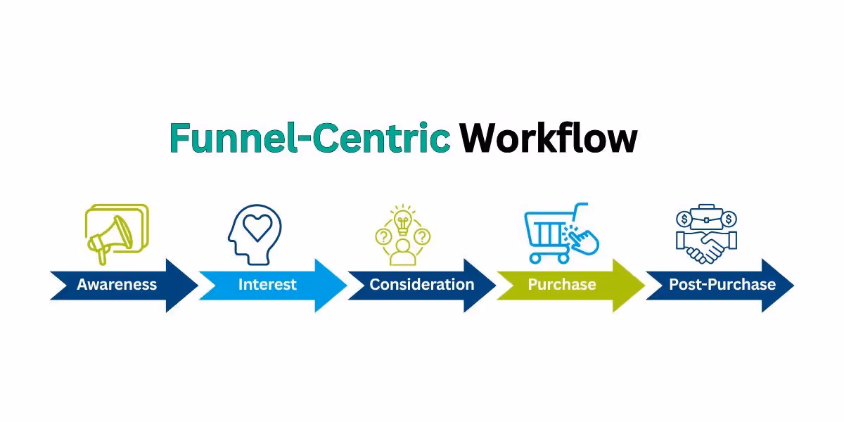The funnel-centric workflow model for WhatsApp advertising begins with a large pool of prospects at the top and narrows it into smaller groups of customers as they move toward the purchase stage. Although the funnel structure differs by brand, the basic stages will always follow these, with some variation depending on how the business operates.