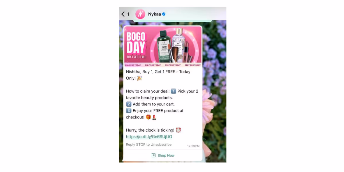 Nykaa’s BOGO (Buy One Get One) Flash Sale is a perfect example of a WhatsApp-driven flash sale: