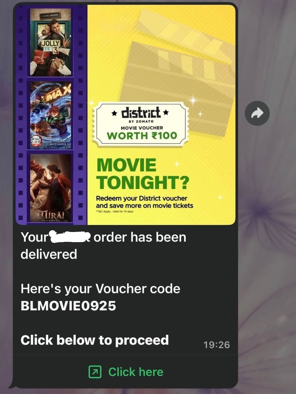 Getting a customer to order once is good, but encouraging repeat purchases drives real growth. Blinkit’s WhatsApp marketing messages demonstrate how to do this effectively. They offer incentives like movie ticket vouchers, making customers feel valued and motivating them to reorder. By combining rewards with personalized messaging, the brand keeps customers engaged and encourages repeat purchases.