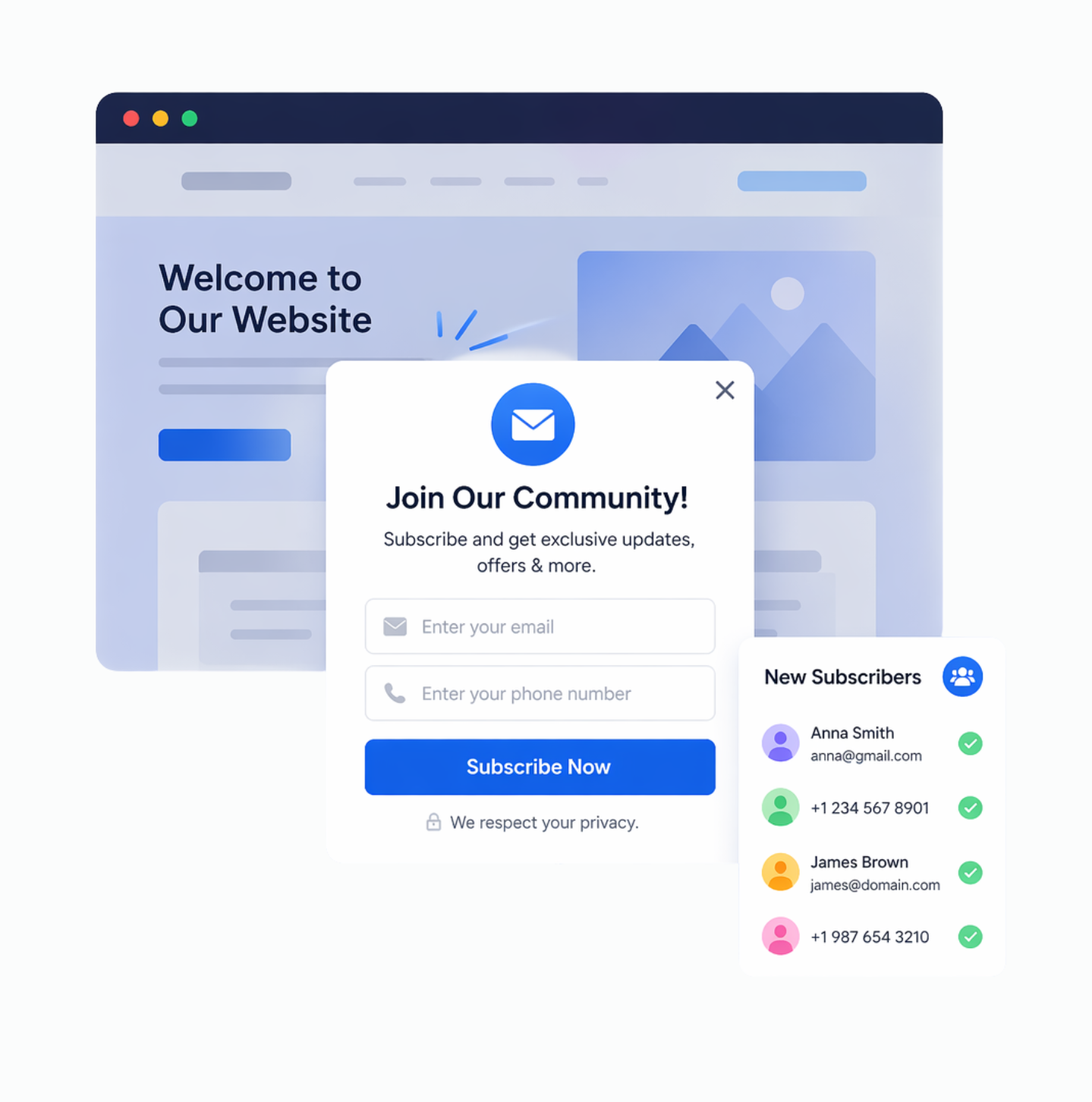 Collect emails and phone numbers directly from your website visitors using high-intent opt-in pop-up tools designed to convert browsing users into subscribers.