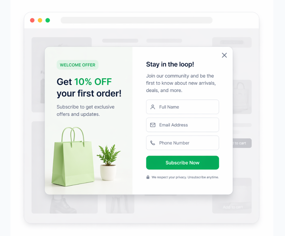 Collect essential customer details through pop-up forms that help capture high-intent subscribers.