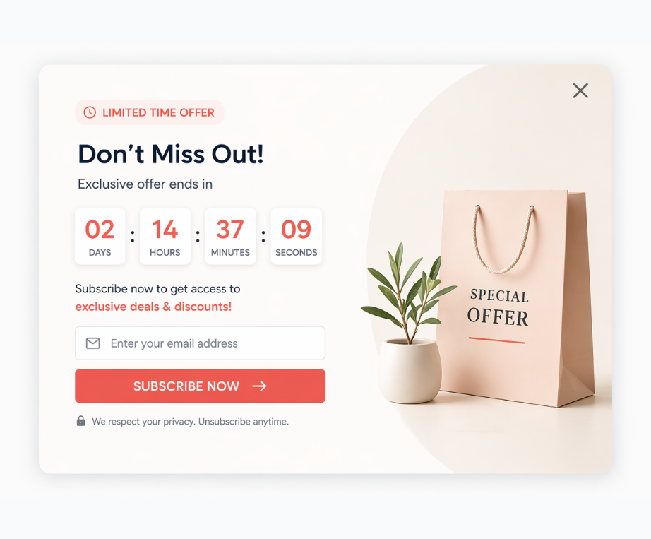Urgency-based countdown pop-ups push visitors to subscribe faster by highlighting limited-time offers and expiring deals.